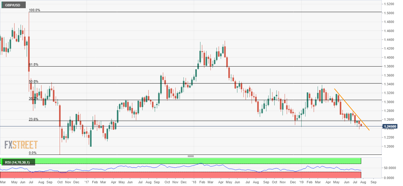 10-week old descending trend-line keeps GBP/USD upside confined as the quote declines to 1.2455 ahead of the UK open on Tuesday.