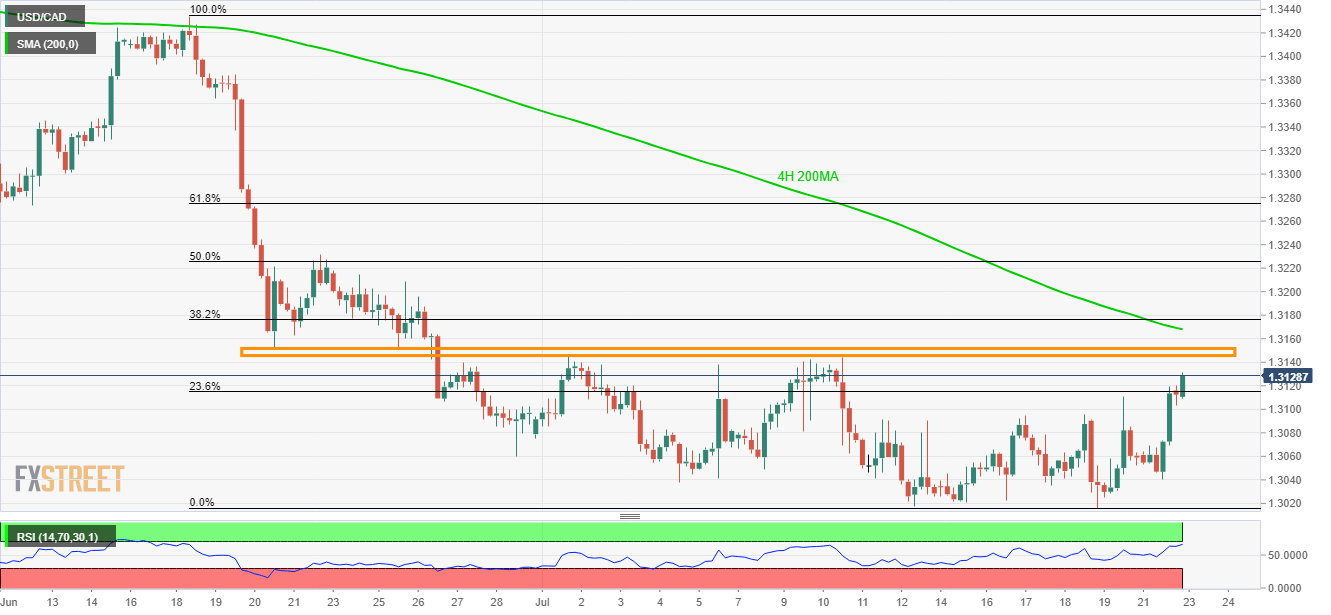 Late-June low and multiple highs marked during the current month portray 1.3145/50 as the closest upside barrier ahead of highlighting 200-bar moving average (4H 200MA), at 1.3168 now.