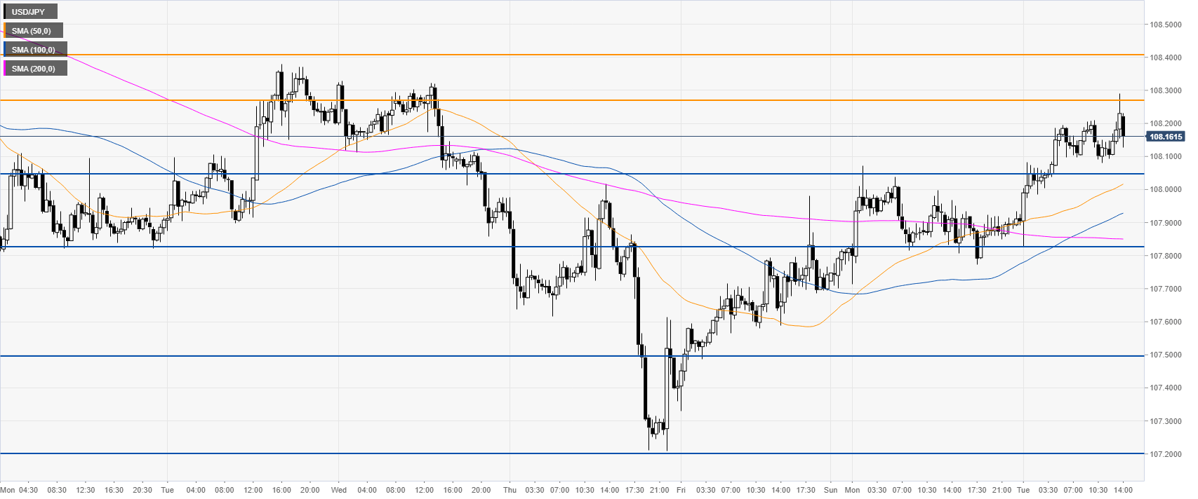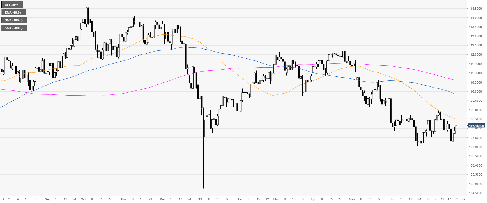 USD/JPY is up for the third consecutive day but still trading below the main daily simple moving averages (DSMAs). Spot is trading above the 108.00 figure.