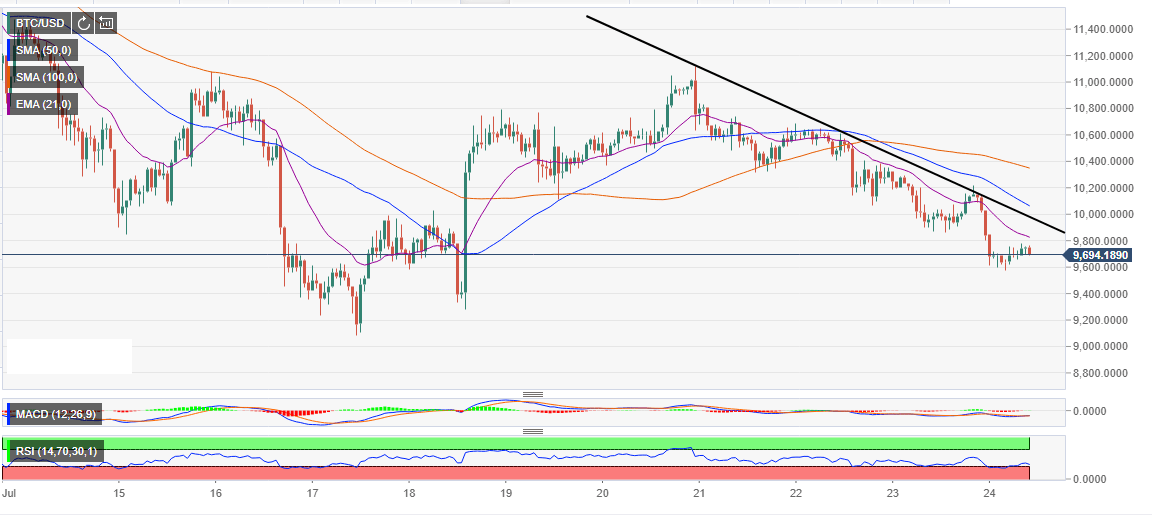 The price is below the moving averages including the 21 Exponential Moving Average (EMA) currently limiting movement at $9,840. The double cross of the 50 Simple Moving Average (SMA) 1-h under the longer term 100 SMA suggests a lower consolidation level for Bitcoin.