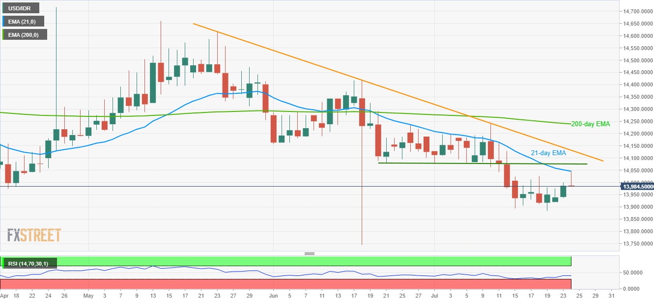 Even after rising to 8-day high, USD/IDR couldn’t clear 21-day exponential moving average (EMA), resulting in a pullback towards 13,985 by the press time of early Wednesday.