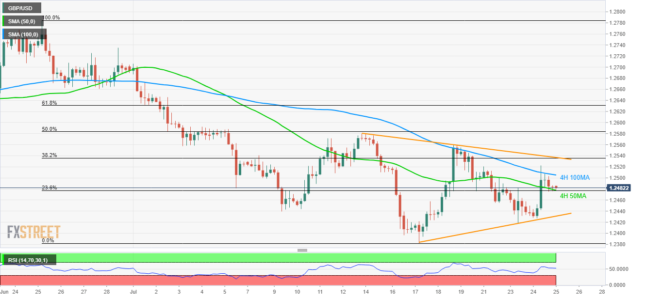 A confluence of 50-bar moving average (4H 50MA) and 23.6% Fibonacci retracement of late-June to early-July downpour confine the quote’s nearby declines at 1.2477/78, a break of which highlights 1.2440/30 support-zone including July 09 low and support-line of the aforementioned triangle.
