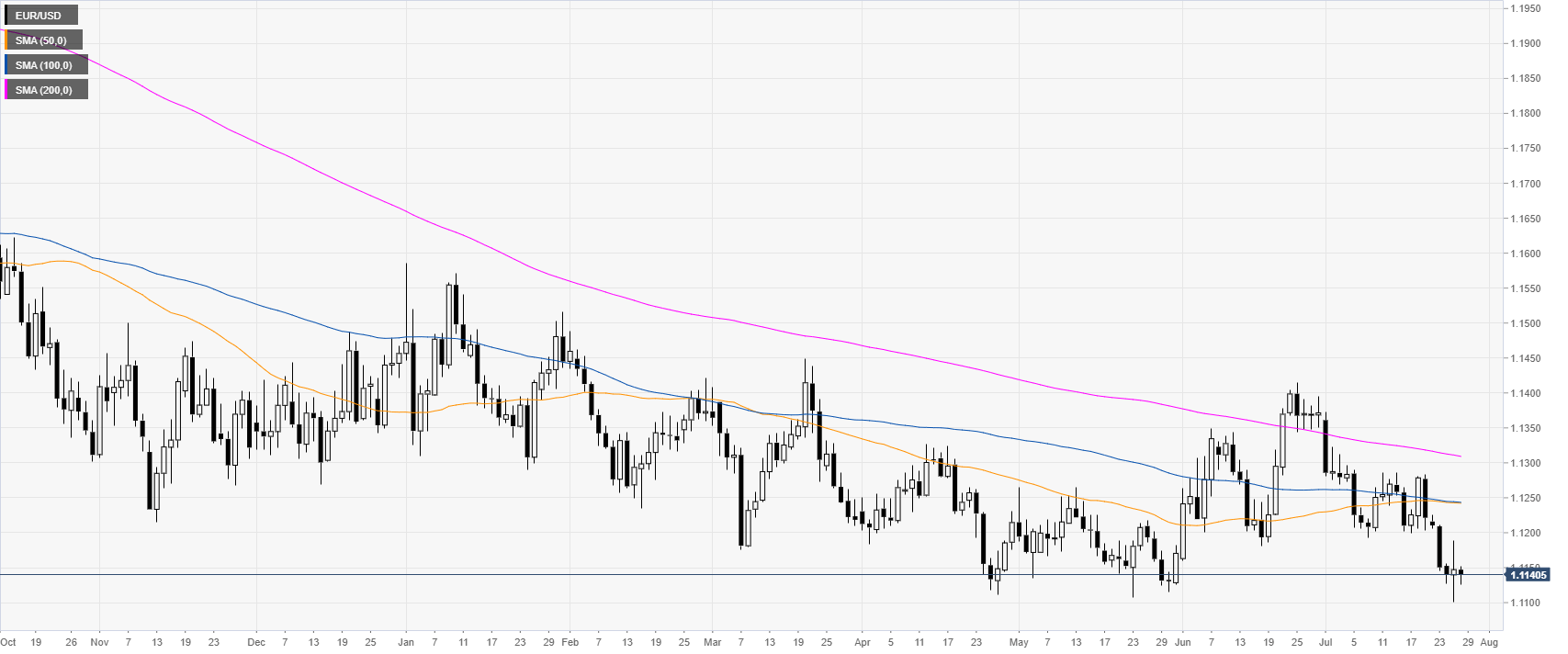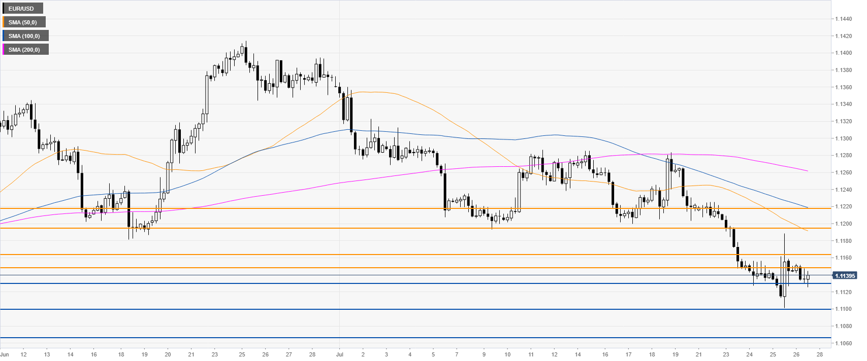 EUR/USD is trading in a bear trend below its main daily simple moving averages (DSMAs). The market hit a new 2019 low on Thursday, but EUR/USD seems to have entered a consolidation phase near 1.1130. The US Gross Domestic Product (GDP) Annualized Q2 came in better-than-expected at 2.1% vs. 1.8% forecast but the data had  virtually no impact on EUR/USD.