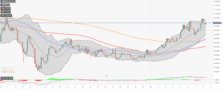 On the intraday basis, XMR/USD is well-supported by $94.00 handle, strengthened by the intraday low. Once it is out of the way, the sell-off is likely to gain traction with the next focus on $93.50. This barrier is created by SMA50 (Simple Moving Average) 1-hour and the middle line of 4-hour Bollinger Band.