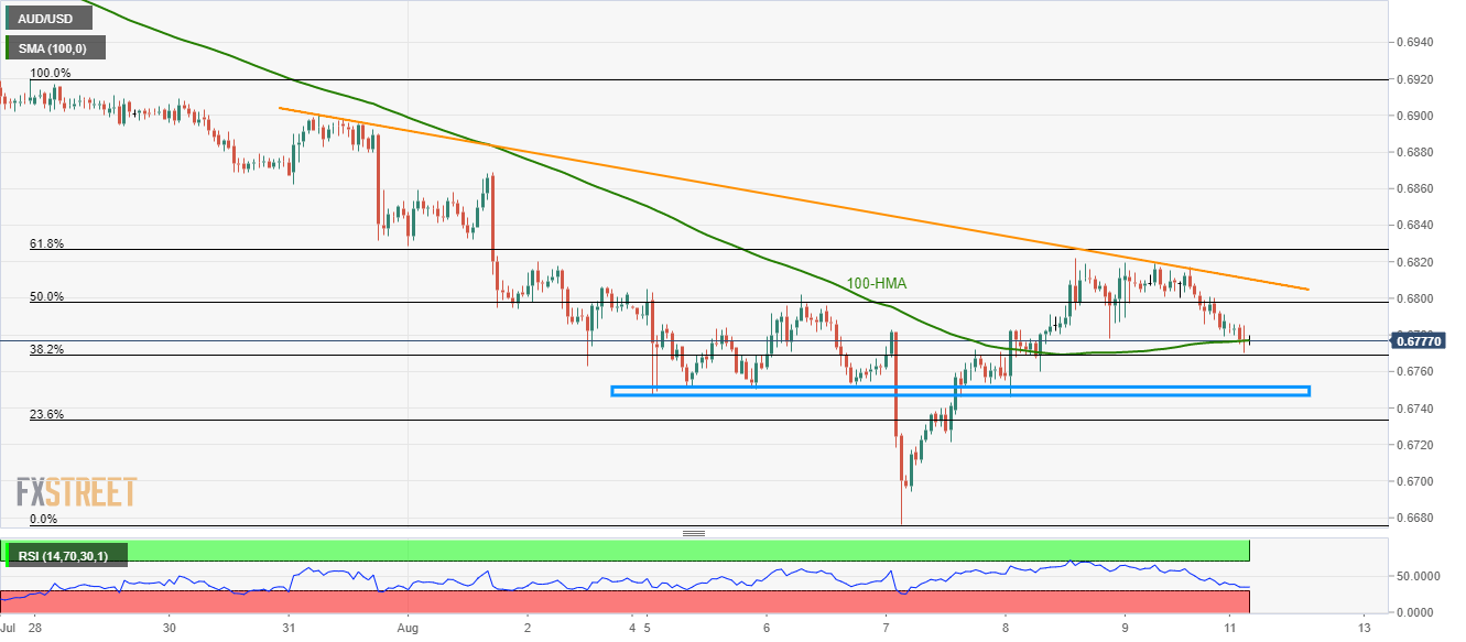 Although failure to break 61.8% Fibonacci retracement of late-July to early-August downpour portrays the AUD/USD pair’s weakness, sellers are being questioned by near-term key supports as the quote seesaws near 0.6780 on early Monday.