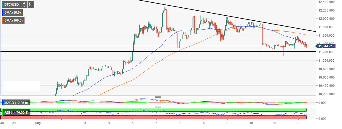 A low was formed at $11,104 leading to a shallow recovery above $11,200. In spite of the correction above this level, $11,600 (100 SMA) remains unconquered. At press time, a building bearish momentum is pushing Bitcoin under $11,400 (50 SMA). Bitcoin is trading at $11,320 while targeting $11,200 support target.