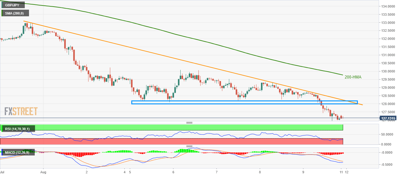 Despite GBP/JPY sellers catching a breath around September 2017 low, the pair remains beneath short-term key resistance-area, not to forget under the 200-HMA, as it trades near 127.14 during the early Asian session on Monday.