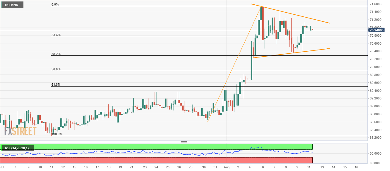 USD/INR follows a week-long Pennant formation while making the rounds to 70.94 ahead of the European session opening on Monday.
