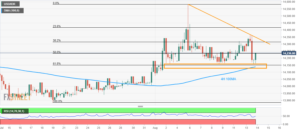 USD/IDR registers another bounce off the key 14,139/55 support-zone as it trades near 14,240 during early Wednesday.