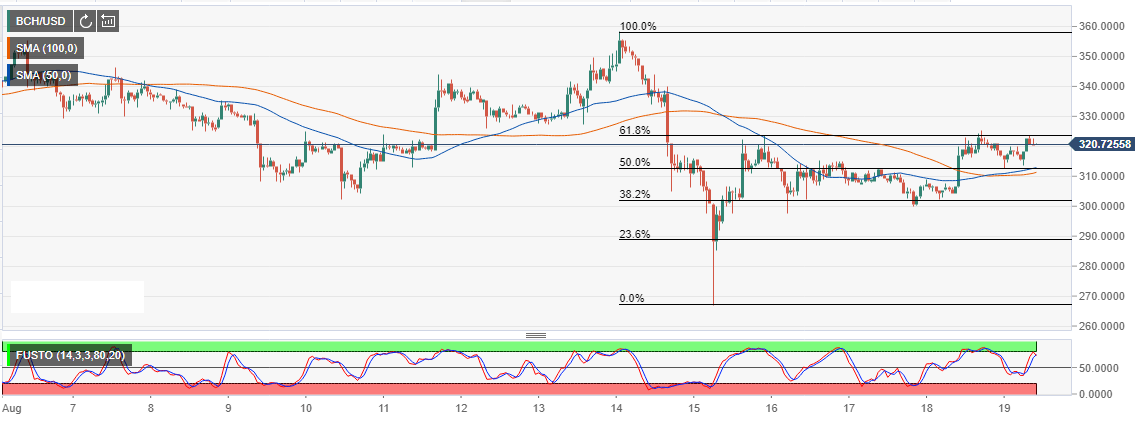 The negative volatility surged sending Bitcoin Cash briefly under $270. A low established at $267.35 allowed the rebound above $300. The battle to break the resistance at $330 is yet to be won. Instead, Bitcoin Cash is trading sideways in a narrow range between the confluence created by the 50% Fib level and the 50 Simple Moving Average (SMA) and $330 hurdle.