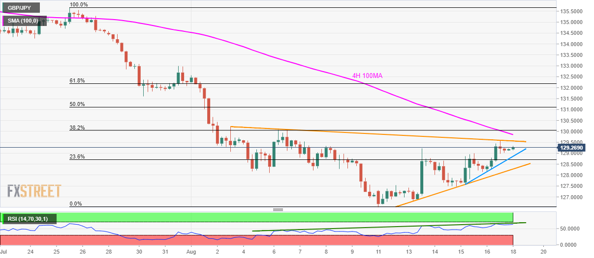 However, a descending trend-line since August 02, at 129.56 now, followed 100-bar moving average on the four-hour chart (4H 100MA) at 129.85 can will question the pair’s further upside ahead of 130.00 round-figure.