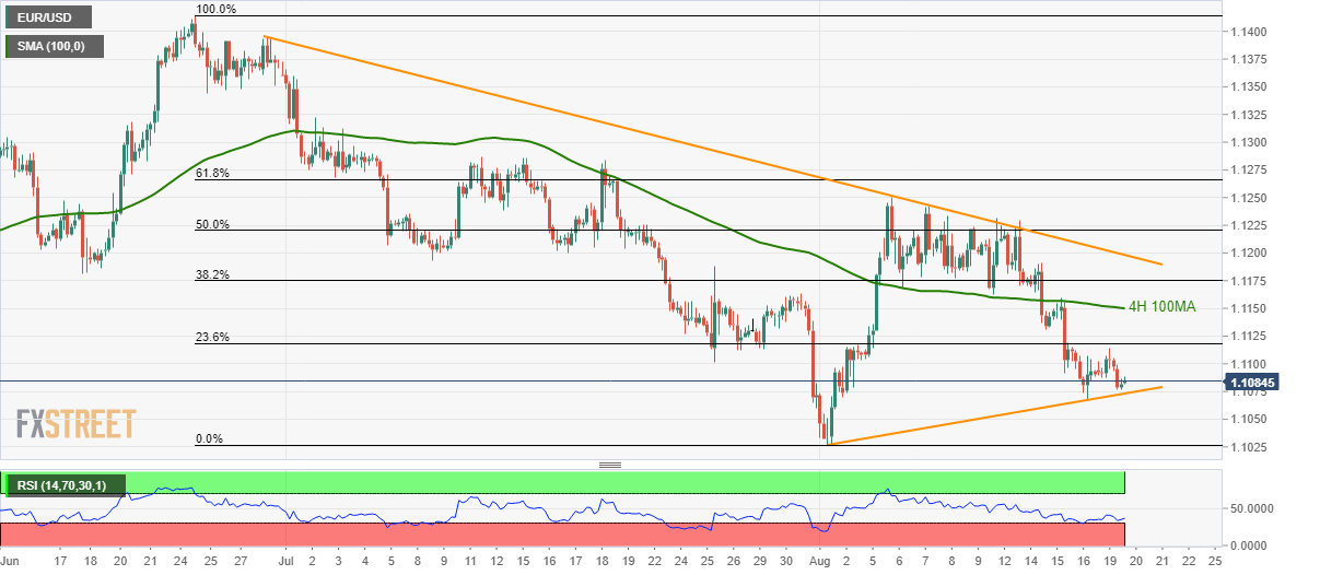 Having bounced off 13-day old support-line, EUR/USD takes the bids to 1.1085 during early Tuesday.