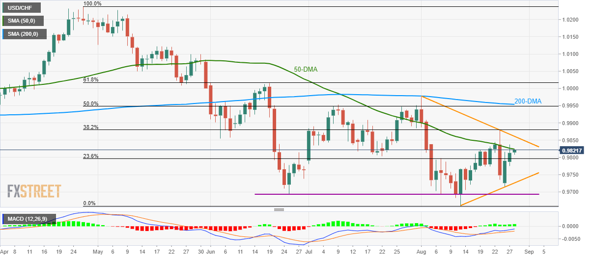Sustained trading beyond 23.6% Fibonacci retracement of April-August declines enables USD/CHF to near the 50-day simple moving average (DMA) while taking the bids to 0.9820 during Wednesday’s Asian session.