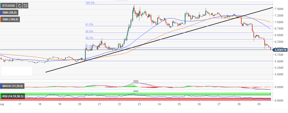 From the support at $5.5, ETC/USD smashed through several resistance areas including the 23.6% Fib retracement level taken between the last swing high of $7.69 to a swing low of $5.5, $6.25and $7.0.