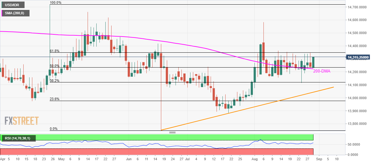 USD/IDR registers another bounce off 200-day simple moving average (DMA) as it trades near 14,315 during Thursday’s Asian session.