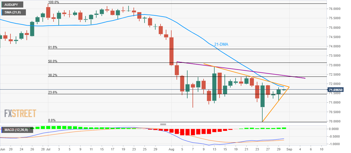 Sustained trading beyond four-day-old rising trend-line favors AUD/JPY to aim for 21-day simple moving average (DMA) as it makes the rounds to 71.70 during early Asian session on Friday.