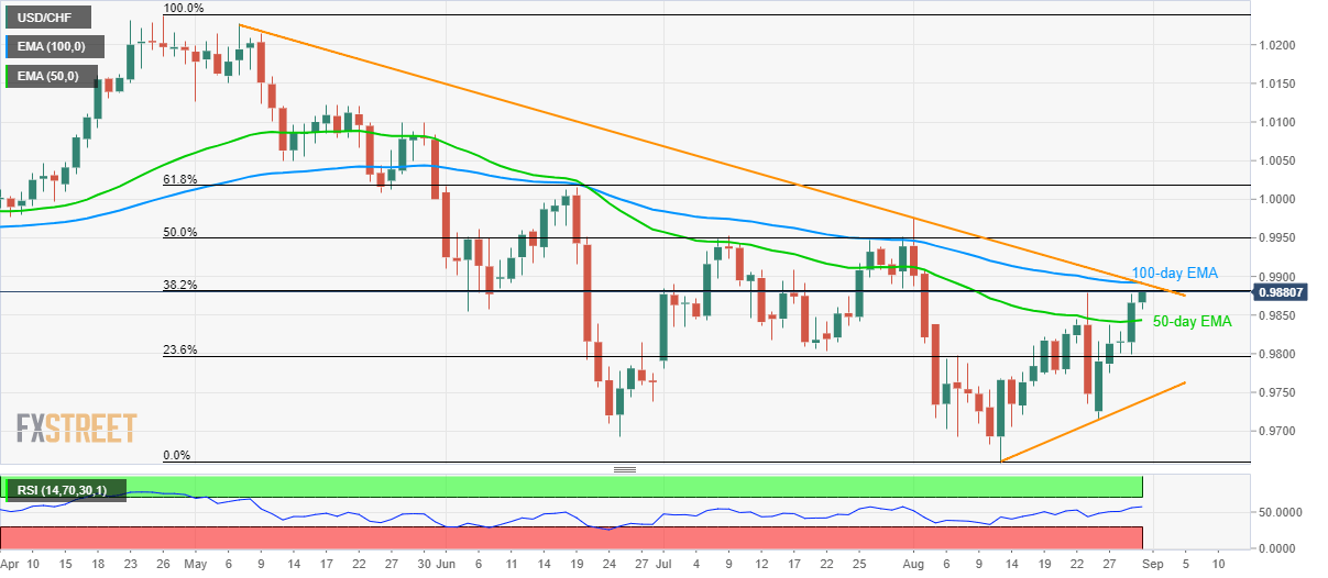 Despite breaking 50-day exponential moving average (EMA), USD/CHF remains below key resistance confluence as it takes rounds to 0.9880 during Friday’s Asian session.