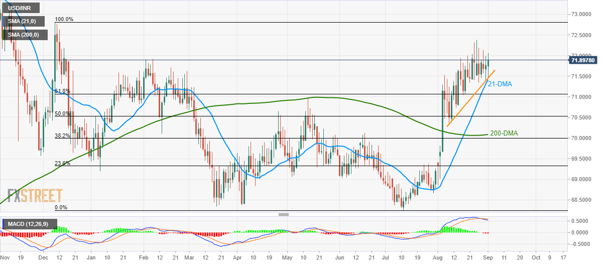 Despite staying positive around 71.90 ahead of Monday’s European session, the USD/INR seems to have lost upside momentum as not only 12-bar moving average convergence and divergence (MACD) but the inability to successfully trade above 72.00 also portrays the bullish exhaustion.