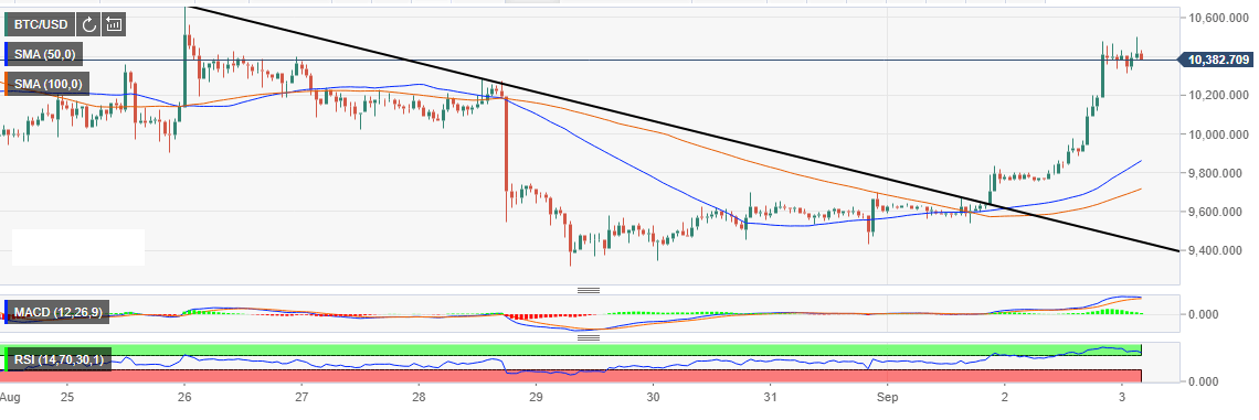 Looking at the hourly chart for BTC/USD trading pair we can spot an effortless price action after the short-term 50 Simple Moving Average (SMA) double-crossed above the longer term 100 SMA. This paved the way for a staggering move past the descending trendline support allowing the buyers to ferociously attack $9,600 and $9,800 resistances.