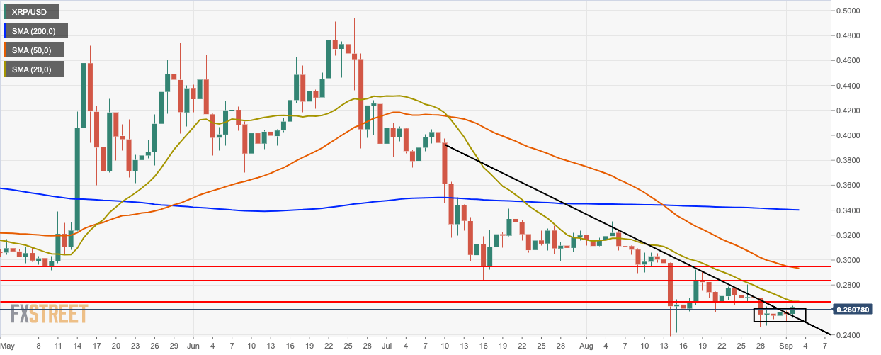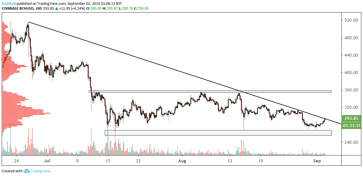 Bitcoin Cash is trading 4.4% higher today as general crypto sentiment carries all the major cryptocurrencies higher. The 4-hour timeframe has a trendline originating on 26th June, with a downtrend that spanned a full two months.