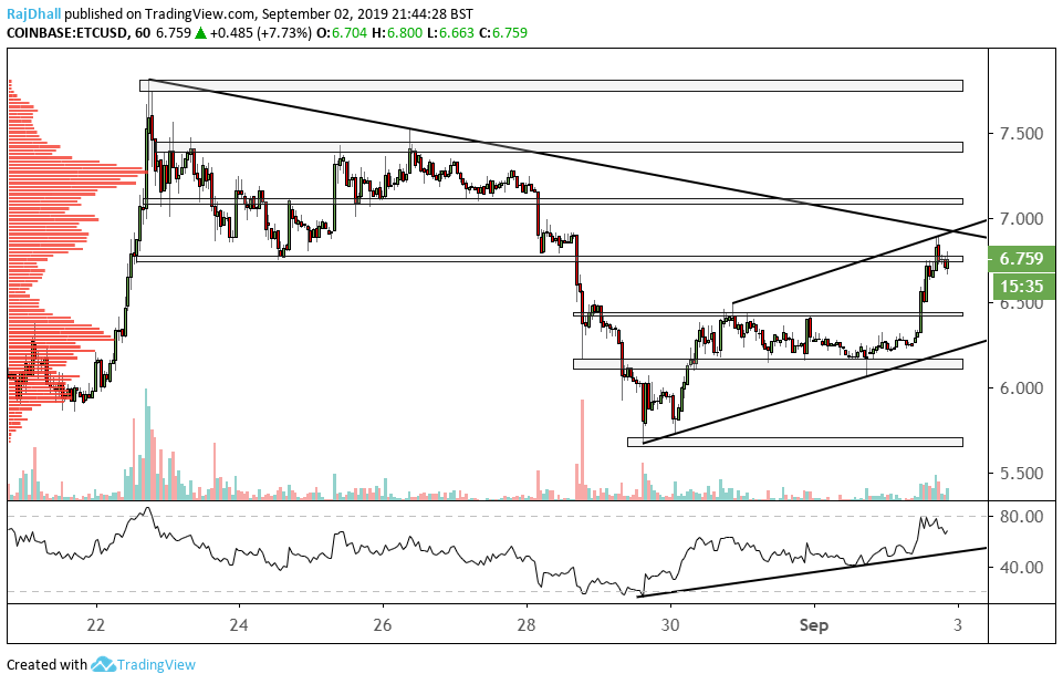 Ethereum Classic is having a great session today rising nearly 8% in line with the general positive crypto sentiment (1-hour chart above). ETC/USD has stopped ahead of the psychological 7.000 level as sellers come in to slow momentum.
