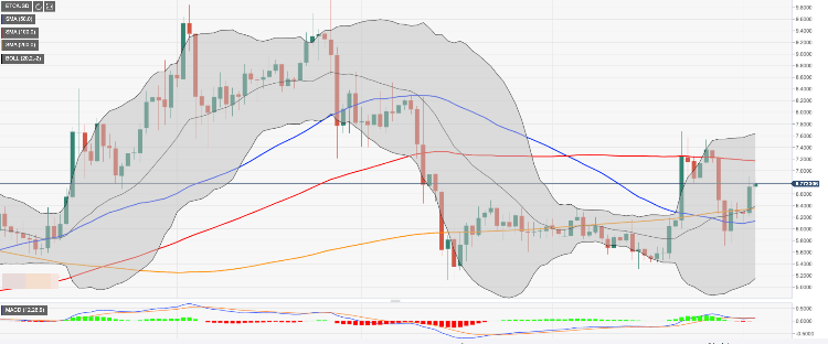The initial resistance awaits us on approach to psychological $7.00. The upper line of 1-hour Bollinger Band and the recent high create a strong barrier for the bulls; however, once it is out of the way, the upside is likely to gain traction with the next focus on $7,70 (the upper line of 1-day Bollinger Band) and $8.00.