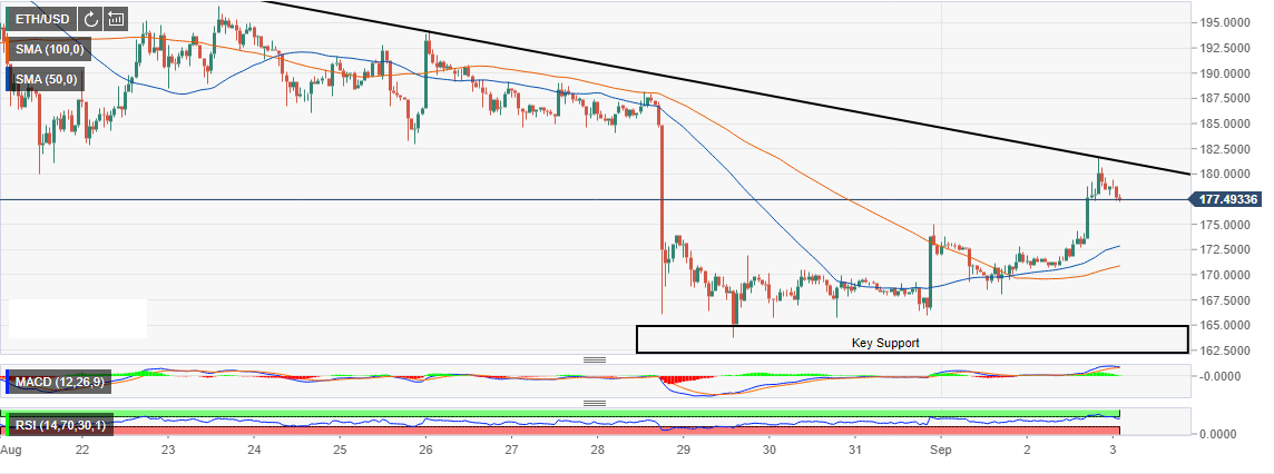 However, among the three Ethereum price lagged behind leaving $200 untested. In fact, the price action above $180 did not hold for long as retracement set in. At the time of writing, ETH/USD is exchanging hands at $177.30 following the rejection from a weekly high of $181.57.