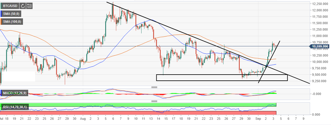 In the event $10,500 support gives in to selling pressure, $10,250 is in line to offer support. The 100 Simple Moving Average and the 50 SMA will also come in handy in case of extended declines. The major support lies between $9,500 and $9,250.