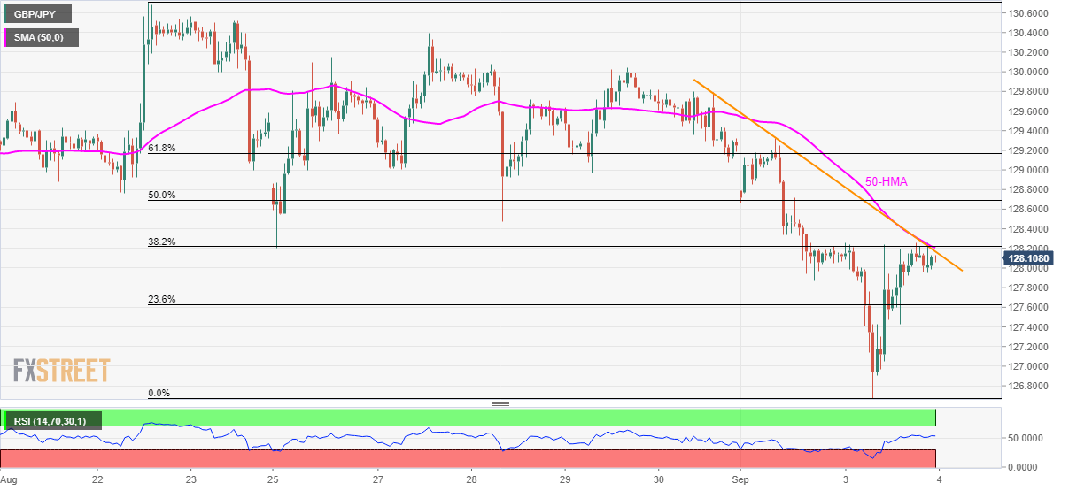 Not only 50-hour moving average (HMA) and a three-day-old falling trend-line but 38.2% Fibonacci retracement of August 22 to September 03 downpour also limit pair’s immediate upside around 128.20/22.