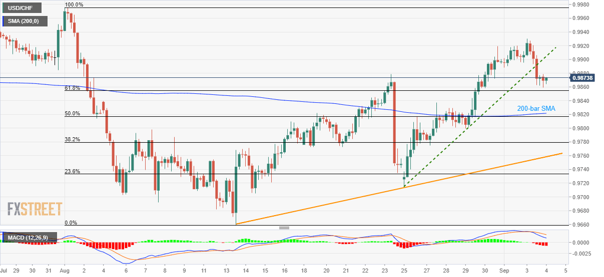 Sellers now aim for 61.8% Fibonacci retracement level of August month downpour, at 0.9854, as immediate support ahead of targeting 0.9822/17 confluence including 200-bar simple moving average (SMA) and 50% Fibonacci retracement level.