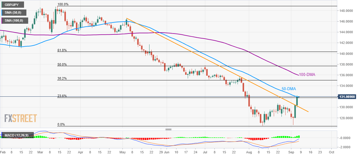 The GBP/JPY pair’s rally to five-week high takes a break near the key upside barrier while flashing 131.98 as a quote during the Asian session on Friday.