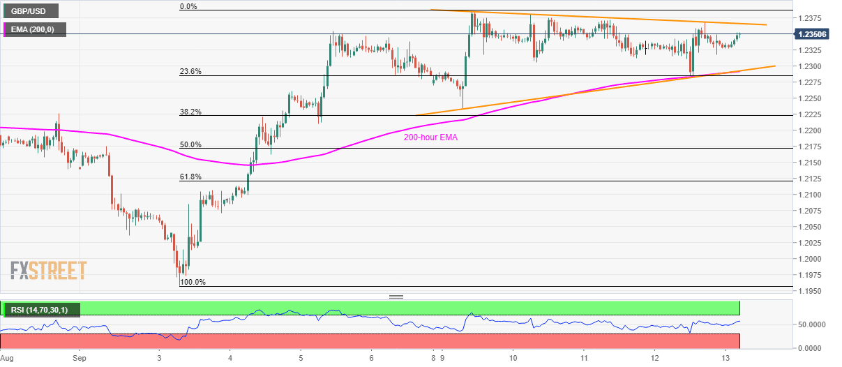 GBP/USD has mostly been in a small trading range portrayed by a four-day-old symmetrical triangle. The quote currently heads to formation resistance while taking rounds to 1.2350 before the UK session starts on Friday.