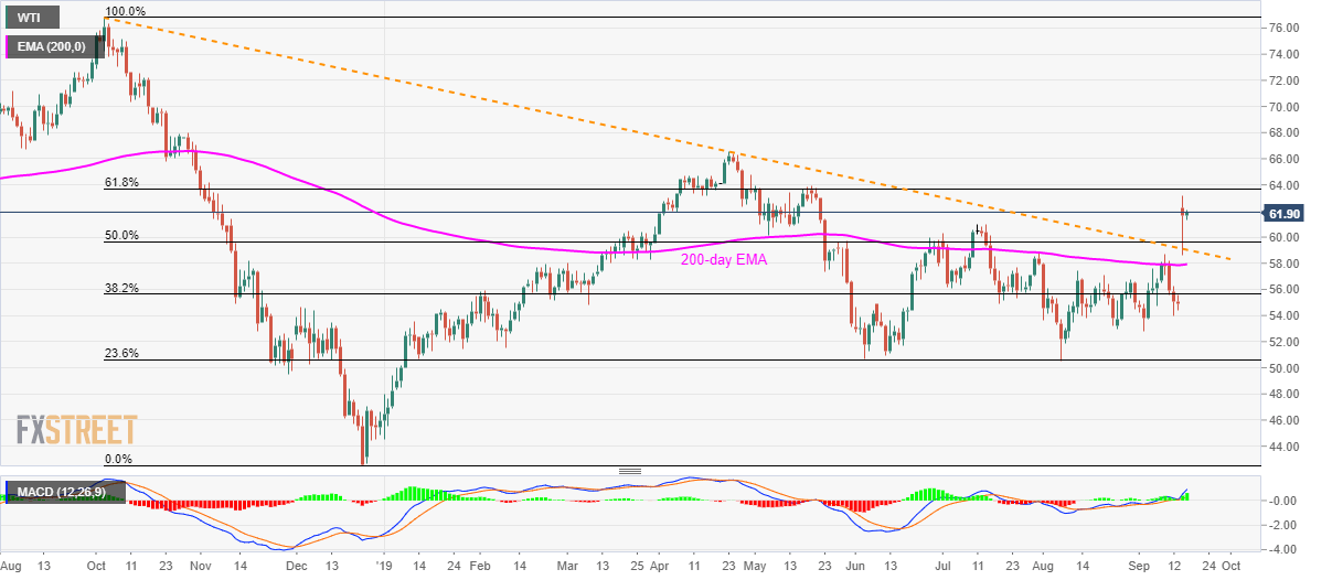 With its sustained trading beyond 11-month-old falling trend-line, WTI takes the bids to $61.80 while heading into the European session on Tuesday.