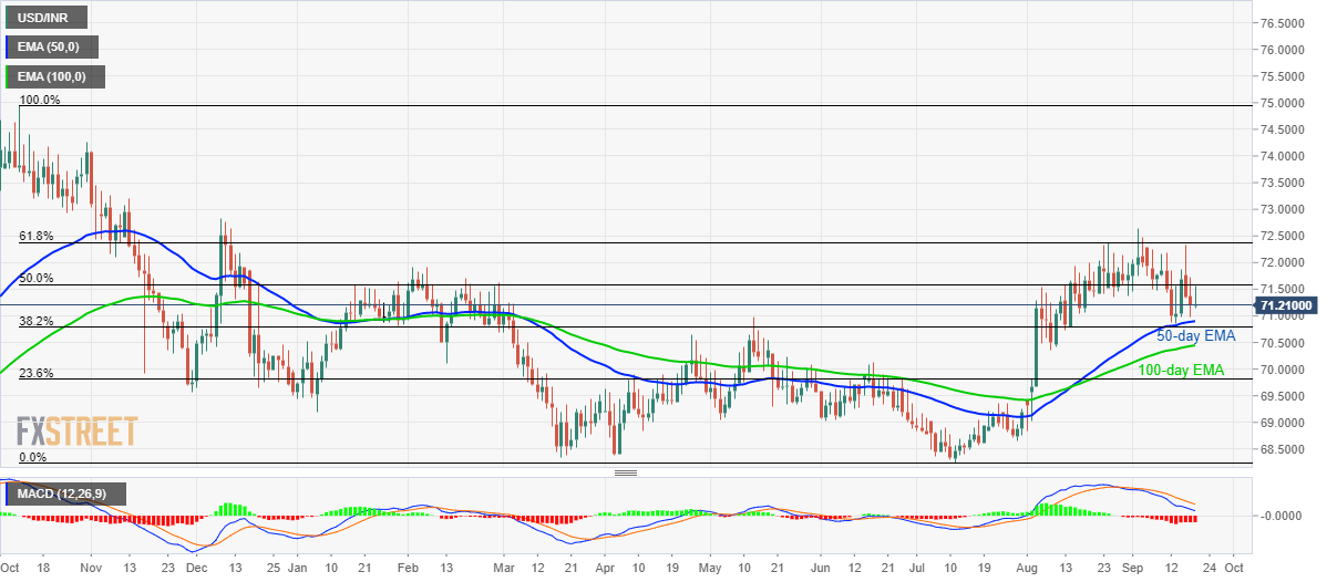 Having reversed from 61.8% Fibonacci retracement of October 2018 to July 2019 downpour, USD/INR declines to 71.23 ahead of Thursday’s European session.