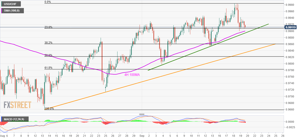 USD/CHF technical analysis: 4H 100MA, 2-week-old support-zone limit immediate declines
