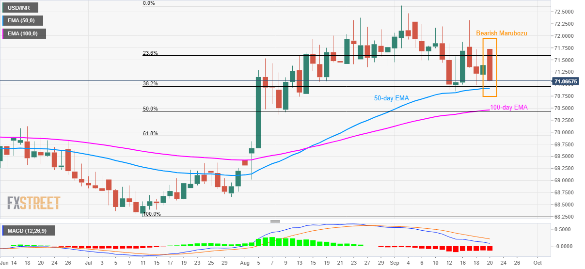 Given the Reuters’ report of Indian diplomats preparing for a stimulus, USD/INR flashes a bearish candlestick formation on daily chart while declining to 71.09 ahead of Friday’s European open.