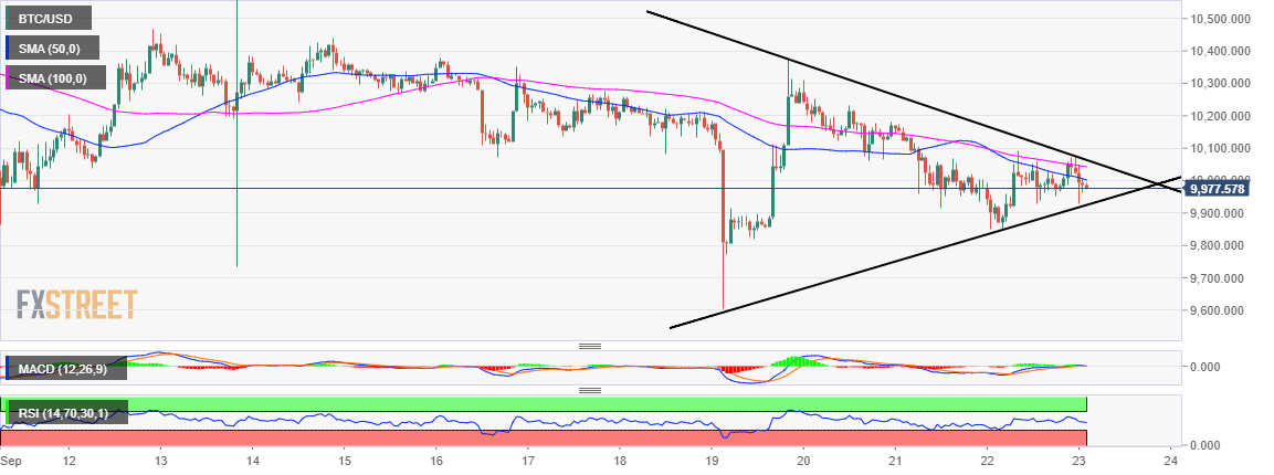 Bitcoin price is dancing slightly under $10,000 after failing to maintain headway over the weekend session. The bears are still holding onto the joystick. A triangle breakout will strongly determine where Bitcoin heads to next.