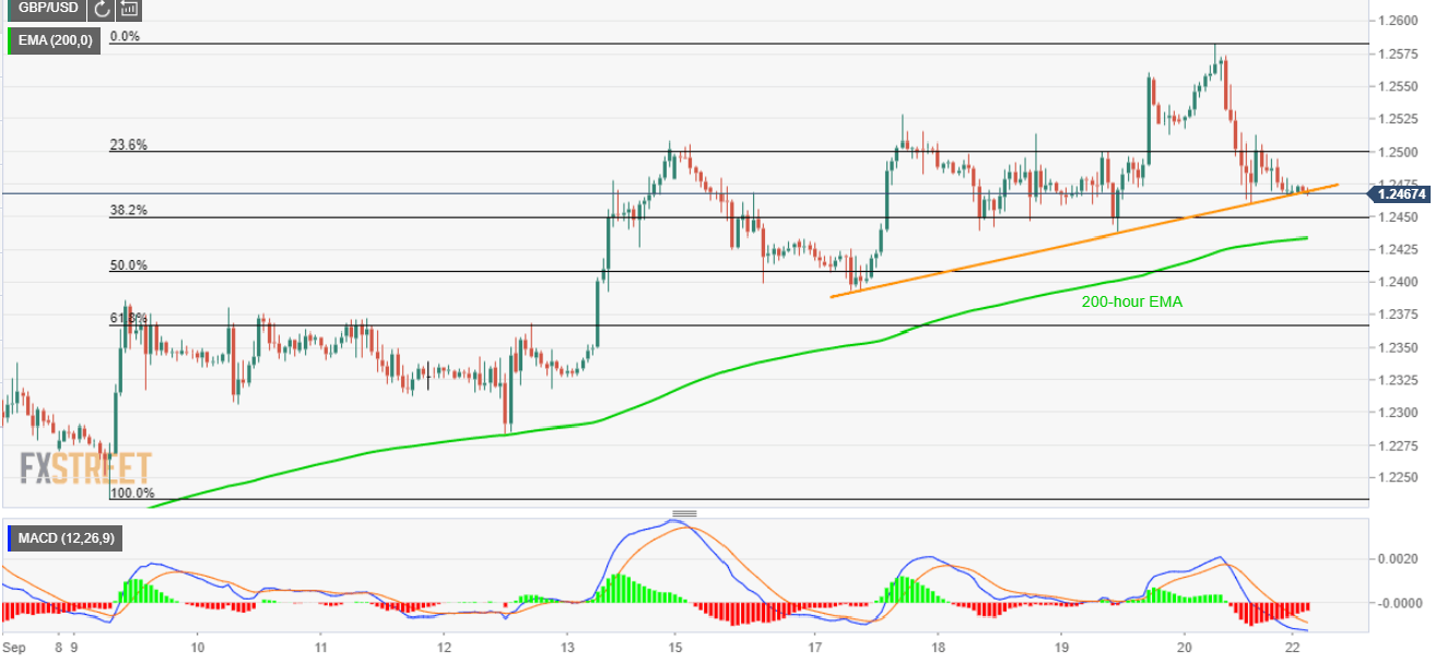 The pair nears a four-day-old rising trend-line level of 1.2470 with a bearish MACD signal favoring further declines to 200-hour exponential moving average (EMA) level of 1.2434.