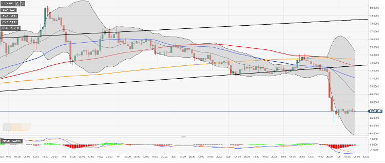 Looking technically, LTC/USD has recovered from Monday’s low of $64.04, though it is still well below critical $70.00. A sustainable move below this handle darkened the technical picture and increased the downside pressure on the coin. The local support is created by the lower line of daily Bollinger Band at $64.30 followed by the recent low of $64.04 strengthened by the lower line of one-hour Bollinger Band. Once it is out of the way, the sell-off is likely to be extended with the next focus on $60.00.