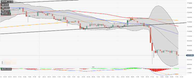 Litecoin resumed the decline after a short period of consolidation. The fifth-largest digital asset with the current market value of $4.2 billion, has lost nearly 10% of its value in recent 24 hours. Litecoin’s collapse was triggered mostly by technical factors; however, the news that China denied state-backed cryptocurrency launch in November migh have served as a fundamental factor behind the sell-off on the market. At the time of writing, LTTC/USD is changing hands at $65.96.