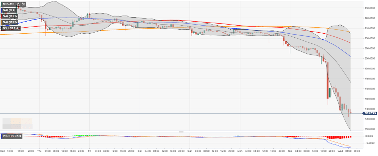 Bitcoin Cash (BCH) is in the free fall since September 20. The coin has lost over $100, or nearly 31% of its value. The bearish pressure increased significantly on Tuesday amid global collapse on the cryptocurrency markets. At the time of writing, BCH/USD is changing hands at $225.70, off the Asian low registered at $220.00. Bitcoin Cash is the fourth largest digital asset with the current market value of $5.2 billion. The coin is down over 6% since the beginning of the day.