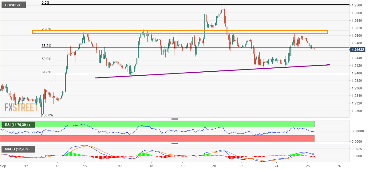 Not only failure to cross multiple mid-month highs and 23.6% Fibonacci retracement of September 12-20 upside but downward sloping 14-bar relative strength index (RSI) and the bearish signal from 12-bar moving average convergence and divergence (MACD) indicator also favor pair sellers.