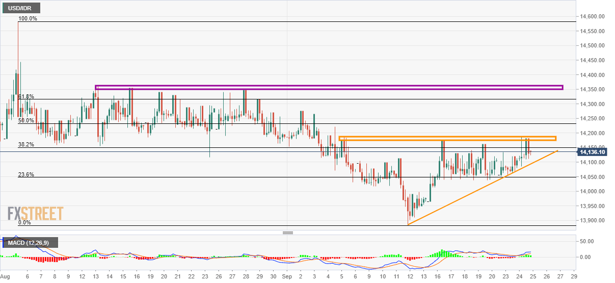 Despite witnessing another pullback from 14,188/90 area, USD/IDR stays inside a short-term bullish triangle formation while trading around 14,135 ahead of the European session on Wednesday.