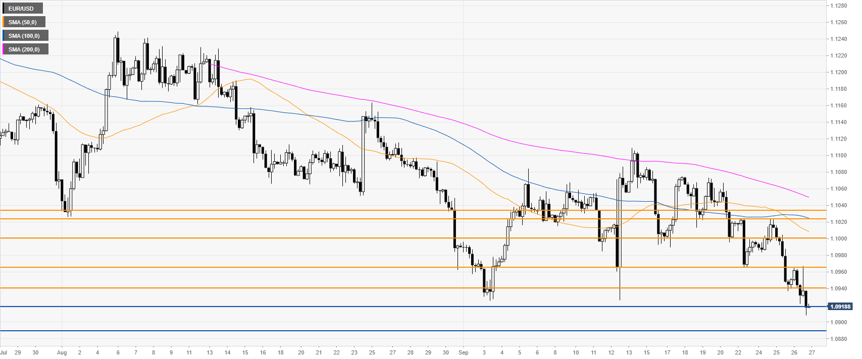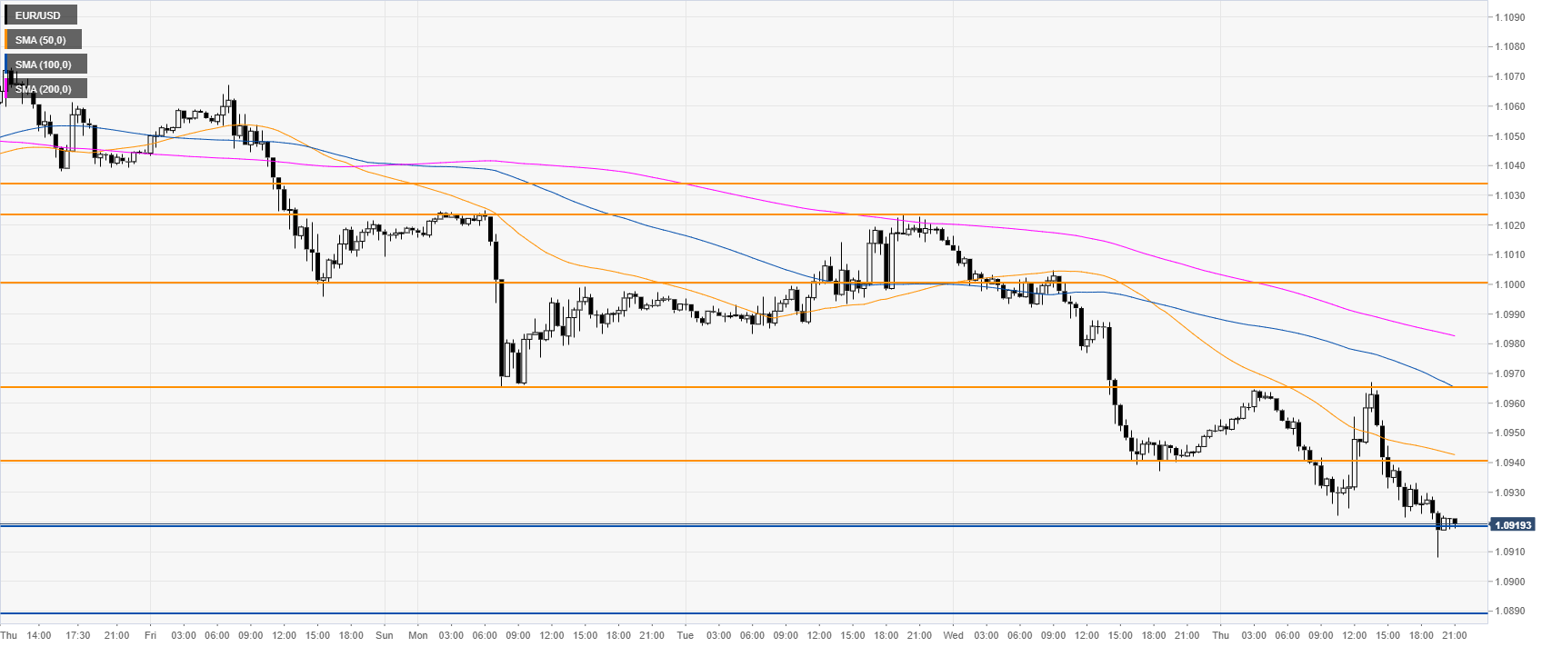• EUR/USD printed fresh 2019  lows this Thursday, reaching the 1.0908 price level.