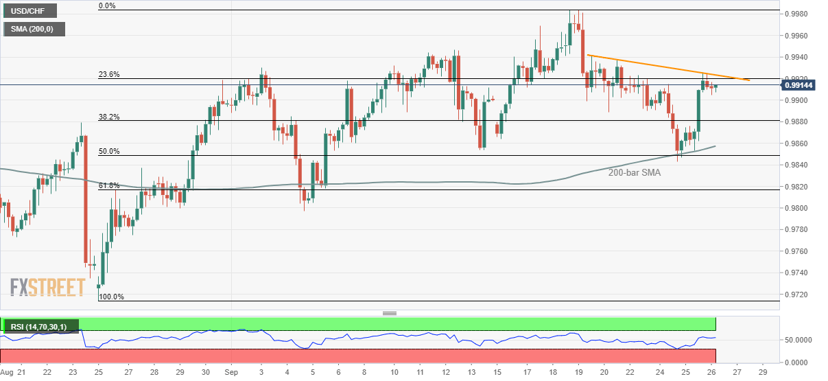Despite bouncing off 200-bar simple moving average (SMA), USD/CHF fails to cross near-term key resistances as it trades around 0.9915 while heading into the European session open on Thursday.