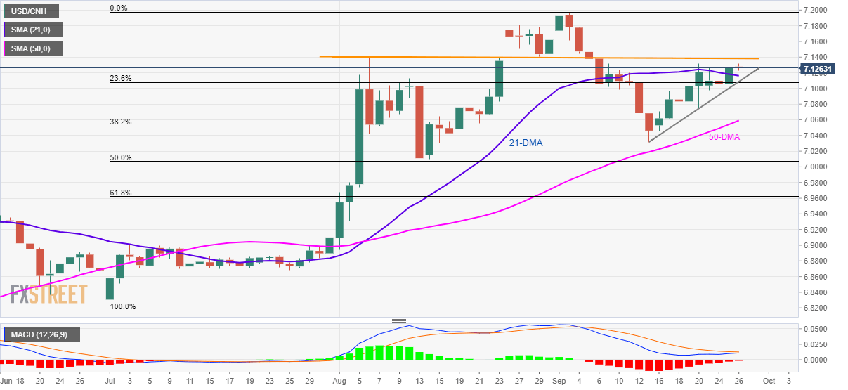 Despite successfully trading above the 21-day simple moving average (21-DMA), USD/CNH is yet to cross near-term key resistance as it makes the rounds to 7.1295 during early Thursday.