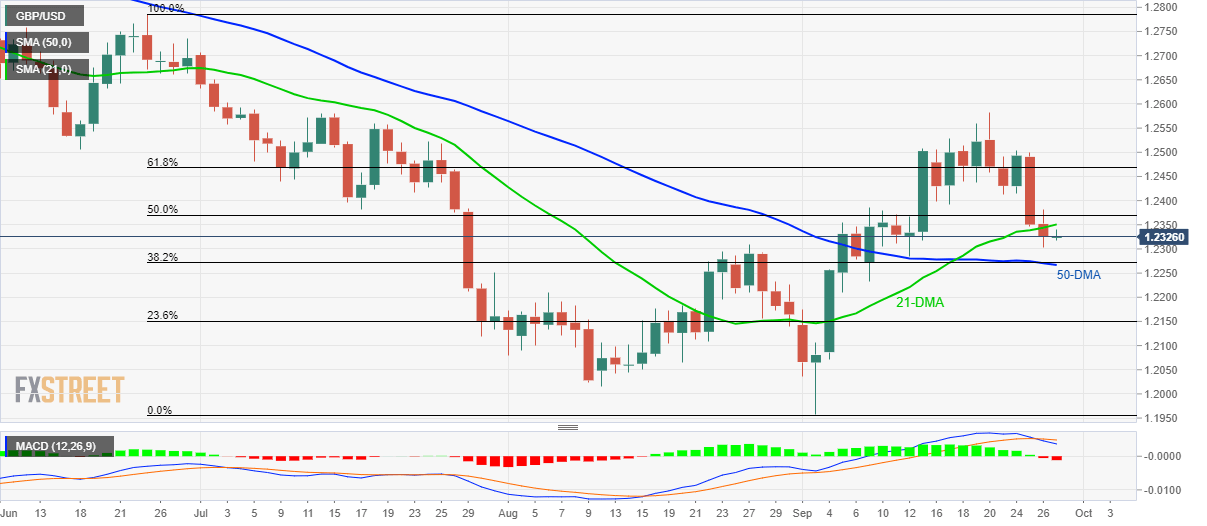 Sustained trading below 21-day simple moving average (DMA), coupled with the bearish signal from the 12-bar moving average convergence and divergence (MACD) indicator, portrays the GBP/USD pair’s weakness as it trades near 1.2325 during Friday’s Asian session.