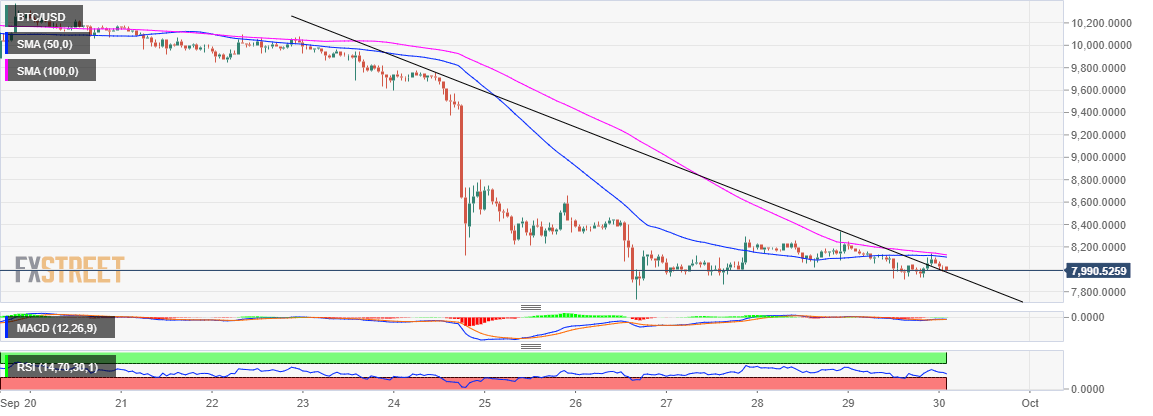 The relative strength index (RSI) is grinding lower after a rejection from the 50’s range. Moreover, the moving average convergence divergence is stuck under the zero line signifying the control the bears have over the price. Apart from the support at $7,900, the next support target is $7,750.