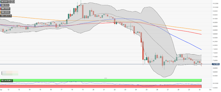 NEO, currently the 21st largest coin with the total market value of $498 million, has lost 3.5% in recent 24 hours and about 2% since the beginning of the day. While the coin has retreated from the recent low of $6.71 (September 26) and recovered above $7.00; however the coin is still vulnerable to further losses.  The coin has lost over 20% in recent seven days.