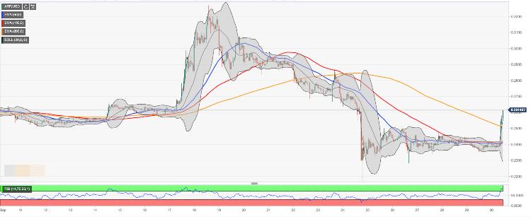 On an hourly chart, XRP/USD jumped above SMA200 (Simple Moving Average) and the upper line of the Bollinger Band for the first time since September 23. The coin is strongly overbought, which implies that we witness a retreat towards the initial support at $0.2550 created by the above-said the upper line of the Bollinger Band. It is followed by psychological $0.2500 with SMA200 one-hour located on approach.